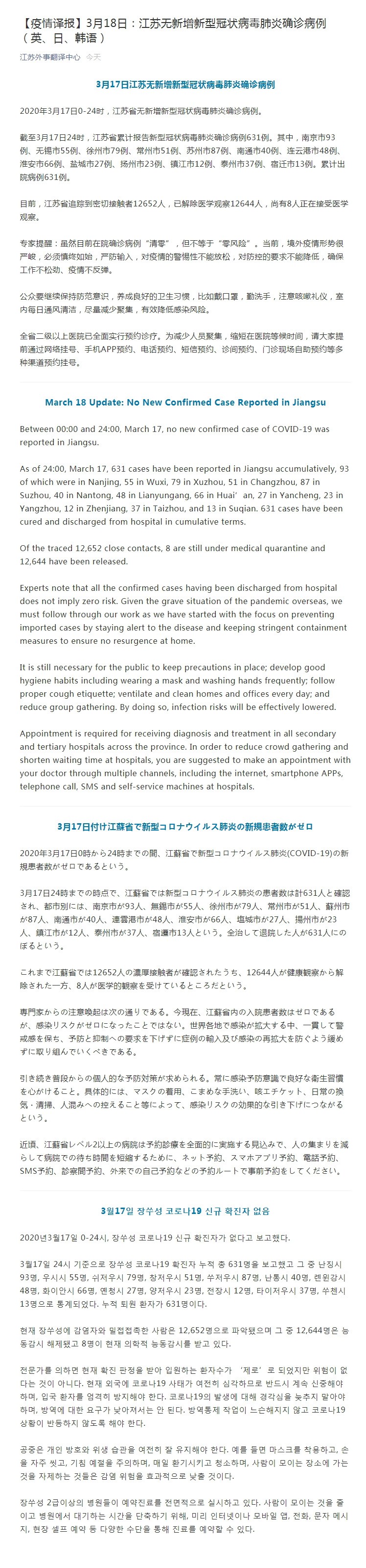 March 18 Update: No New Confirmed Case Reported in Jiangsu