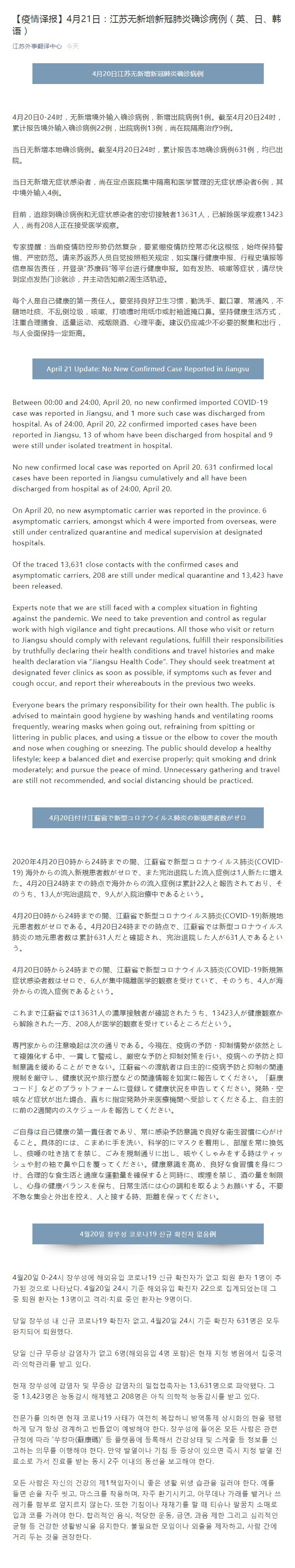 April 21 Update: No New Confirmed Case Reported in Jiangsu