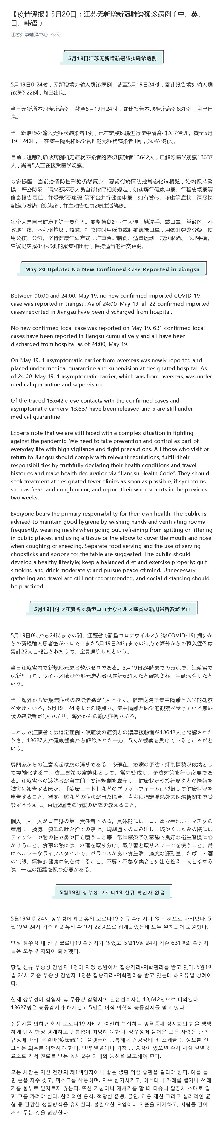 May 20 Update: No New Confirmed Case Reported in Jiangsu