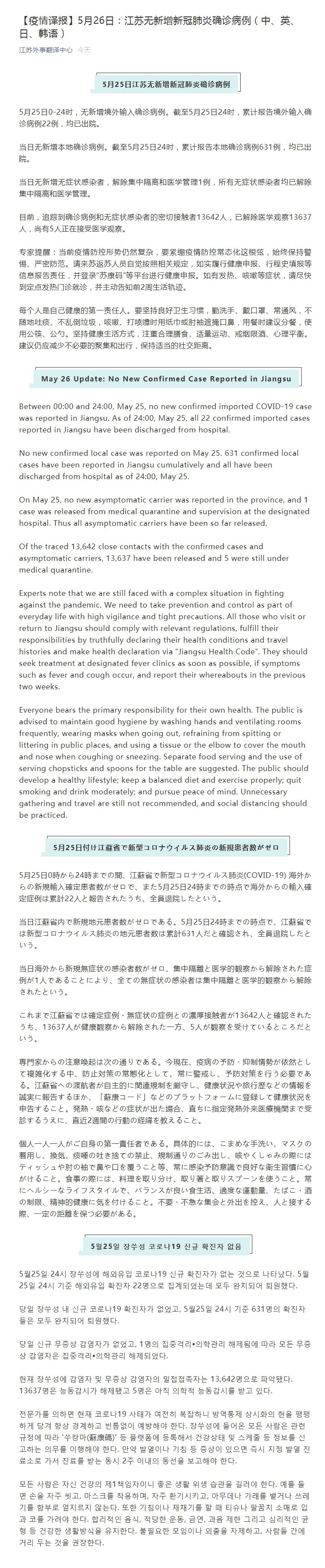 May 26 Update: No New Confirmed Case Reported in Jiangsu