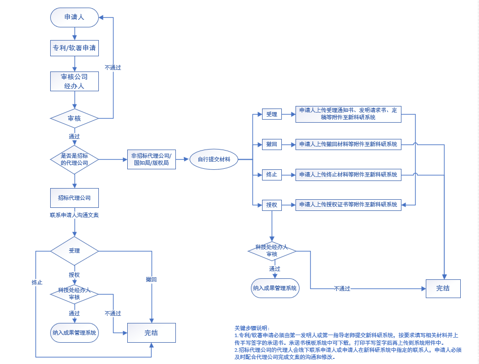 3.申请人需仔细确认由系统提交的相关材料,包括专利/软著名称、发明人、专利权人、著作权人以及它们的排序,一旦提交不可随意更改。如需更改,需由原第一发明人提交说明材料至所在部门,所有发明人签字,第一发明人所在部门领导签字盖部门章后报科技处审批,审批通过后由科技处进行系统变更。