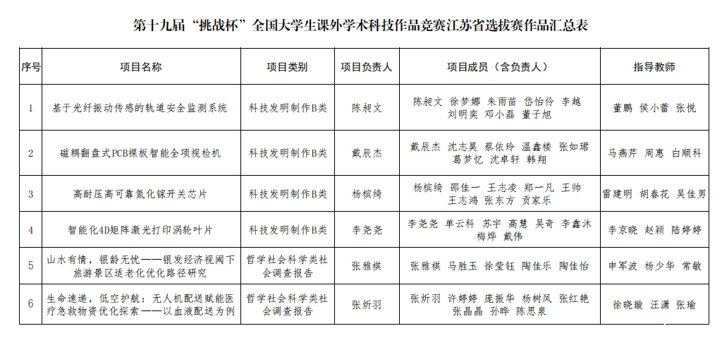 经学院推荐、校级选拔,我校参加第十九届“挑战杯”全国大学生课外学术科技作品竞赛省赛作品已确定,拟推荐《基于光纤震动传感的铁路轨道安全监测系统》等6项作品参赛(具体项目见附件),现对省赛推荐项目进行公示。公示时间为4月18日—4月23日,如对公示名单有异议,请在公示时间内以电话或书面的形式向校团委反映。