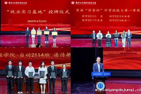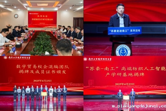 徐雨祥与高宏彦共同为数字贸易校企混编团队揭牌。该团队由苏豪集团5位企业导师及商务贸易学院5位教师联合组成,未来将聚焦跨境电商、数字营销等领域培养复合型贸易人才。徐雨祥与高宏彦共同为“苏豪-南工”高端纺织人工智能产学研基地揭牌,该基地的建立将聚焦人工智能与纺织业融合,推动技术创新与产业升级。徐雨祥和高宏彦等校企相关负责人为前期在首届“苏豪杯”外贸技能大赛获奖的20位同学颁奖。