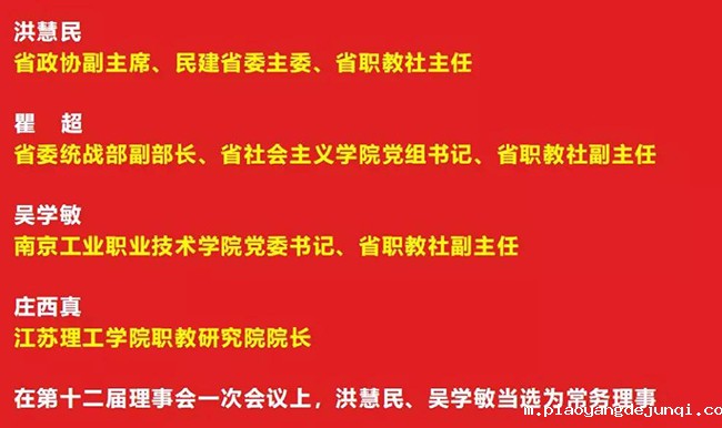 会议选举产生了第十二届理事会。全国人大常委会副委员长、民建中央主席郝明金当选为理事长,全国政协副主席、民建中央常务副主席辜胜阻以及孙尧、汤涛、张伯军、龙庄伟、王刚、李家杰、苏华当选为副理事长。会上,江苏省4名同志全票当选中华职教社第十二届理事。我校党委书记吴学敏当选为第十二届理事会常务理事。