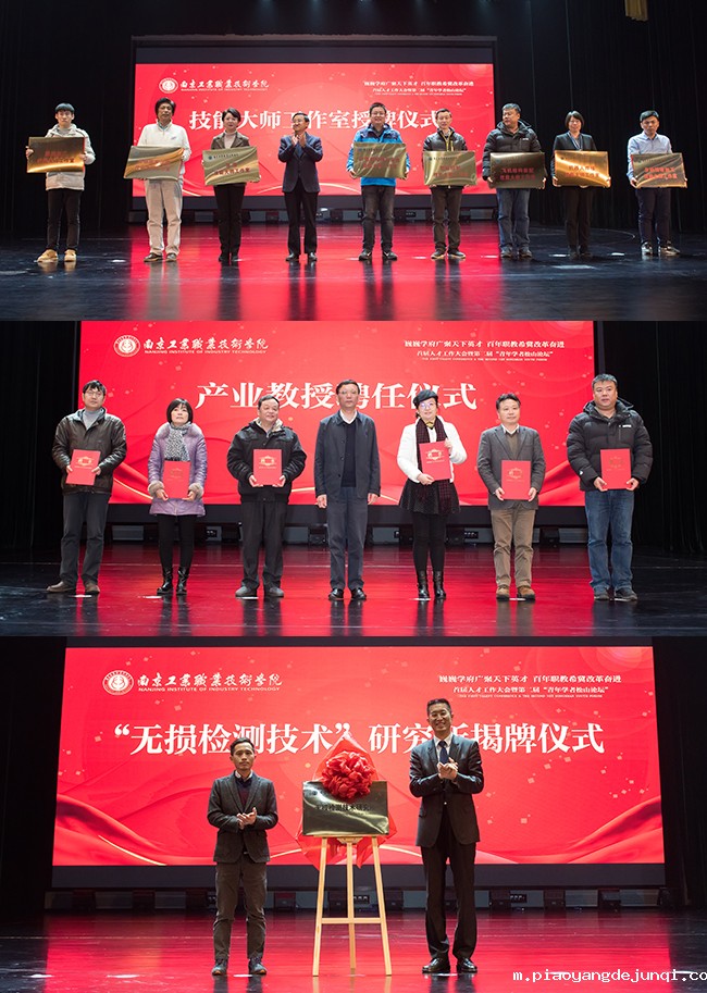 会上,举行了各类高层次人才聘任仪式。首先,举行了“技能大师工作室”授牌仪式。8位聘任的技能大师,个个身怀绝技,他们当中,有全国车工、钳工、电焊工等高级技师;有全国五一劳动奖章获得者;有全国技能大赛冠军等等。大师们将依托工作室,把丰富的阅历、精益求精的工匠精神和成长成才的经历传递给学生,并且指导工程训练课程设置、职业技能大赛、“双师型”教师培训等等。接下来,举行了“产业教授聘任仪式”,6位来自企业的产业教授接受聘书。再次,举行了“无损检测技术”研究所揭牌仪式。宋增禄是我校2017年从日本引进的博士,以宋博士为带头人,成立了由12名博士组成的科技创新团队,学校总投入400余万元,为他们设立了“无损检测技术”研究所。随后,举行了“高层次年薪制人才签约仪式”,7位高层次人才签约年薪制。