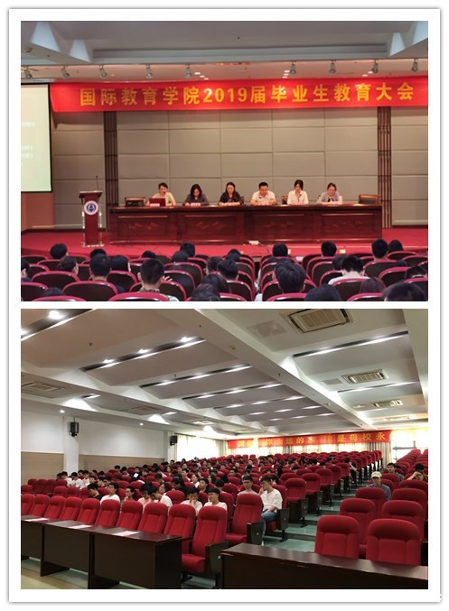 为确保2019届毕业生安全文明离校、顺利毕业,5月28日,国际教育学院在学术交流中心报告厅举行了2019届毕业生教育大会。国际教育学院党总支副书记、副院长张莉,副院长张平,教学办、全体辅导员、班主任代表及2019届165名中方毕业生和37名留学生参加了本次大会。会议由辅导员陈赛珊主持。
