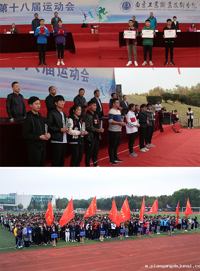 本届运动会总裁判长韩小盛老师宣读南工院第十八届运动会学生团体总成绩及最佳运动员名单;副校长朱建国宣读本届运动会精神文明代表队名单。校领导为获奖代表颁奖。纪委于林惠书记宣布南京工业职业技术学院第十八届运动会闭幕。