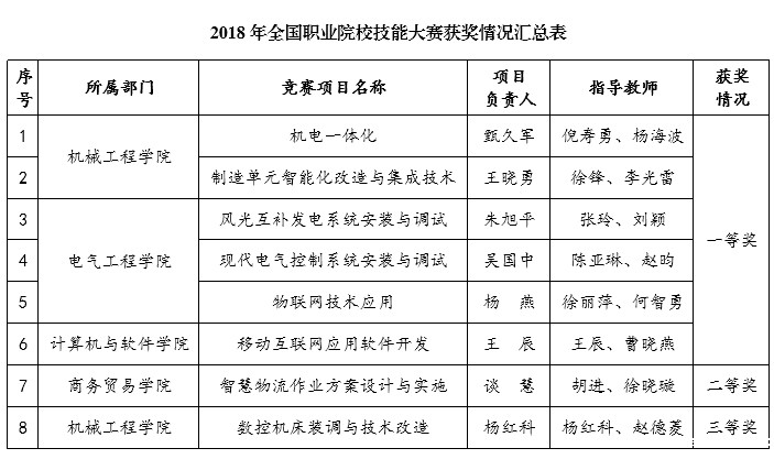 获得一等奖的机电一体化、制造单元智能化改造与集成技术、风光互补发电系统安装与调试、现代电气控制系统安装与调试、物联网技术应用和移动互联网应用软件开发等项目中,机电一体化、风光互补发电系统安装与调试、现代电气控制系统安装与调试和移动互联网应用软件开发项目获得一等奖第一名,传统优势专业地位凸显、十三五战略新兴专业特色崛起。