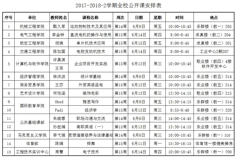 开展教学观摩活动是我校今年“课堂质量年”系列活动之一,本学期在各教学单位开展公开课的基础上,遴选出15门课程,在全校范围内开展教学观摩活动。具体事宜通知如下: