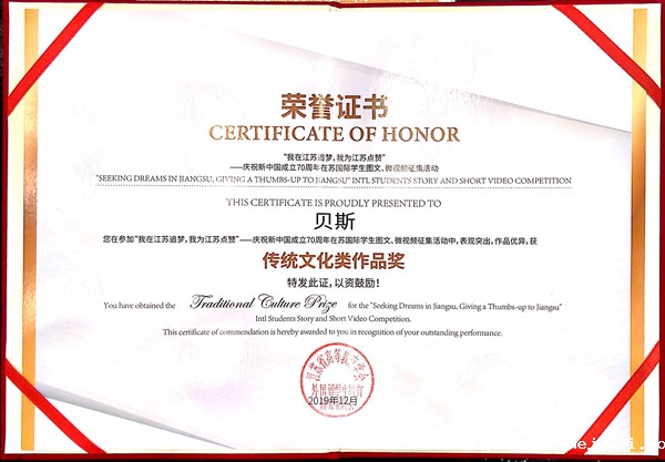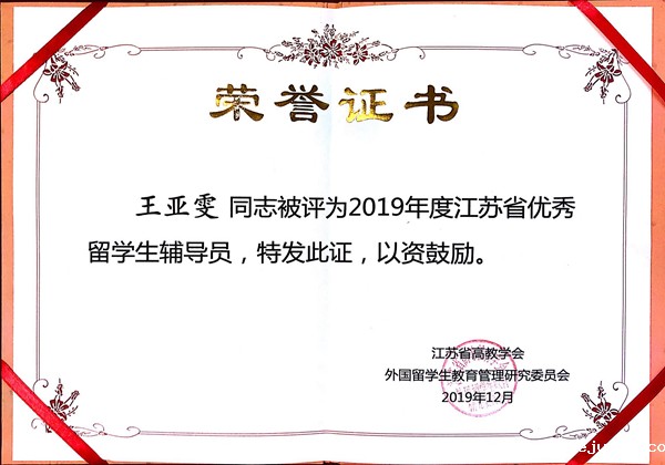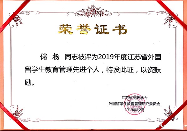 会上,江苏省高等教育学会外国留学生教育管理研究委员会副理事长俞晓南宣读了表彰决定。我校国际教育学院储杨老师获得“江苏省外国留学生教育管理先进个人”称号,王亚雯老师获得“江苏省优秀留学生辅导员”称号,贝斯同学获得“我在江苏追梦,我为江苏点赞”——庆祝新中国成立70周年在苏国际学生图文、微视频征集活动“传统文化类作品奖”。