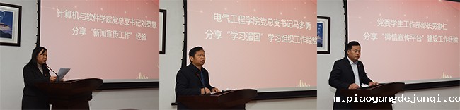 会上,进行了工作经验分享。计算机与软件学院党总支书记刘英慧从“坚持理论武装、严肃政治要求”、“坚持分类指导、强化队伍建设”、“坚持守正创新、筑牢阵地建设”三个方面分享了“新闻宣传工作”经验;电气工程学院党总支书记马多勇从“提高政治站位、深化思想认识”、“用好学习强国、明确责任分工”、“制定工作方案,强化政治任务”、“表彰积极分子、学习纳入评先评优”等五个方面分享了“学习强国”学习组织工作经验;党委学生工作部部长劳家仁从“宣传内容上讲好身边故事,着力提升感染力”、“形式设计上紧紧抓住大学生的需求点、兴趣点和关键点”、“发布时效性上需紧扣时代脉搏,发挥学校重大仪式、国内外重大事件的思想引领和精神强化功能”等三个方面分享微信公众号建设工作经验。