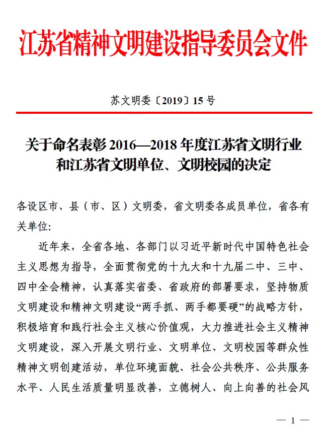 近日,江苏省精神文明建设指导委员会下发《关于命名表彰2016—2018年度江苏省文明行业和江苏省文明单位、文明校园的决定》(苏文明委〔2019〕15号),我校被授予“江苏省文明校园”荣誉称号。