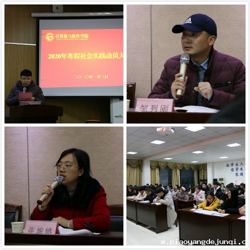 为深入学习贯彻党的十九届四中全会精神,进一步学思践悟习近平新时代中国特色社会主义思想和新时期志愿服务工作的重要指示精神,不断深化实践育人,引导学生在社会实践中受教育、长才干、做贡献,引导青年学生主动走进基层一线,弘扬社会主义核心价值观,亲身感受中央新政策为基层经济社会文化生活带来的新面貌、新气象,引领广大青年学生更加坚定跟党走中国特色社会主义道路的理想信念,结合学院自身优势特色,积极投身全面建成小康社会伟大实践,根据学校《关于组织开展2020年大学生寒假社会实践活动的通知》的精神,计算机与软件学院于1月3日在敬业楼415会议室年举行了寒假社会实践活动动员大会,学院各团支部学生干部参加了本次大会。