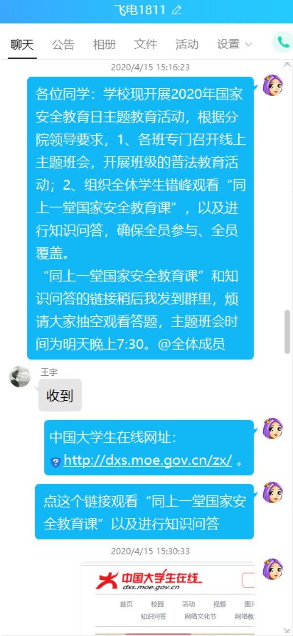 为进一步推动国家安全宣传教育工作深入开展,帮助同学们认清国家安全形势,提高师生国家安全意识,增强国家安全责任,根据学校《关于开展2020年国家安全教育日主题教育活动的通知》要求,航空工程学院灵活创新方式手段,通过举办“维护国家安全,人人都是主角”国家安全主题教育活动、组织全院学生开展国家安全知识在线问答、线上讨论、主题“云”班会等活动进行交流学习。