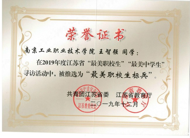 航空工程学院电信1721班王振凌、计算机与软件学院移动1723班王智强等两位同学获评2019年度“江苏省最美职校生标兵”荣誉称号;电气工程学院电气1731班徐冲、计算机与软件学院软件1731班丁建阳、宋清卿等三位同学获评2019年度“江苏省最美职校生”荣誉称号。