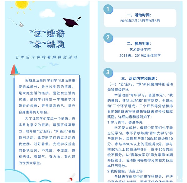 为进一步提升学生的责任与担当意识,增强班级和寝室的凝聚力,发挥班干部和寝室长在学生三自管理中的作用,激励学生积极投入暑期社会实践活动,利用假期加强学习,提升自身的知识素质,艺术设计学院于7月23日-9月6日举办“‘艺’起行,‘术’新风”暑期特别活动。
