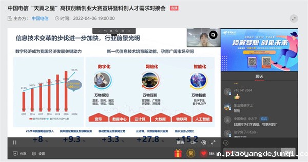 为了贯彻落实国家发展和改革委员会、教育部、人力资源和社会保障部等部门联合印发的《关于深入实施创业带动就业示范行动力促高校毕业生创业就业的通知》(发改办高技〔2022〕187号)文件精神,做实双创示范基地结对共建,4月6日,csgo直播比赛官方平台与中国电信集团有限公司联合举办“天翼之星”高校创新创业大赛线上宣讲暨科创人才需求对接会。学校创新创业学院相关负责人以及近300名师生代表参加了线上会议。