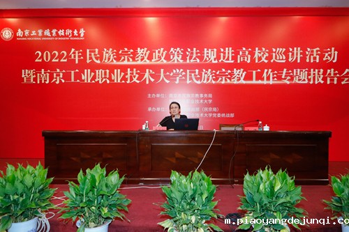 6月22日下午,我校民族宗教工作专题报告会——“2022年民族宗教政策法规进高校巡讲活动”在学术交流中心二楼报告厅举行。南京市委统战部副部长、市民族宗教事务局党组书记、局长苏宇红作专题报告。栖霞区委常委、统战部部长章晶,栖霞区委统战部常务副部长周和斌,学校党委书记吴学敏,党委副书记、校长谢永华,党委副书记王伟,党委常委、副校长苏小冬,党委常委、纪委书记、省监委派驻监察专员于林惠,党委常委、副校长霍雄飞,党委常委、副校长朱建国,党委常委、副校长孙雁飞,党委常委、副校长崔新明,党委常委、副校长潘旭海,党委常委、党委统战部部长、党委组织部部长、机关第一党总支书记高宏彦,党委常委、党委宣传部部长刘畅出席本次活动。