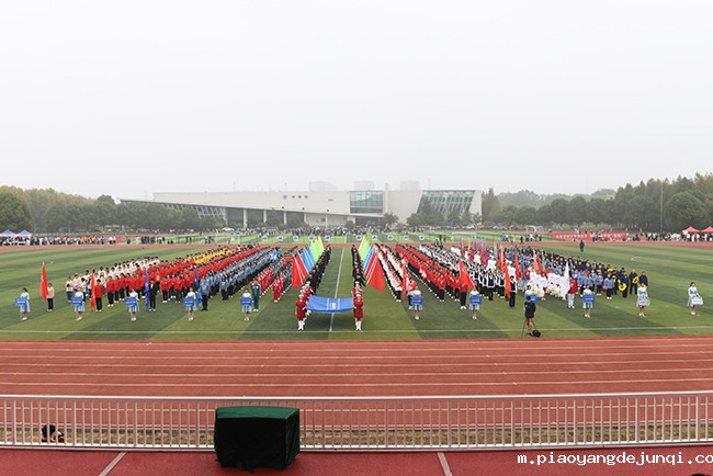 伴着昂扬奋进的《运动员进行曲》,学生代表队、教职工代表队依次入场,精心设计的队形和道具、独具特色的服装、掷地有声的口号和热情自信的笑容,无不散发着青春的蓬勃朝气,现场气氛高涨,观众席传出掌声阵阵。本届运动会学生参赛队伍由587名运动员组成,分别进行24个项目的比赛。除全校学生踊跃参与外,学校19个分工会都派出优秀代表,积极参加教职工趣味运动会及健步走活动。运动员入场后,全场举行了庄严的升国旗仪式。在《义勇军进行曲》的雄壮旋律中,鲜艳的五星红旗冉冉升起,迎风飘扬,全场肃立,向国旗行注目礼。李蒲玲、程德慧和史家伟分别代表裁判员、教职工运动员和学生运动员宣誓。