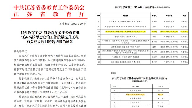 11月21日,省委教育工委、省教育厅公布了首批江苏高校思想政治工作质量提升工程有关建设项目遴选结果,我校同时入选高校思想政治工作精品项目和江苏省高校思想政治工作中青年骨干队伍建设项目,并均以优异成绩被推选参加教育部评审。