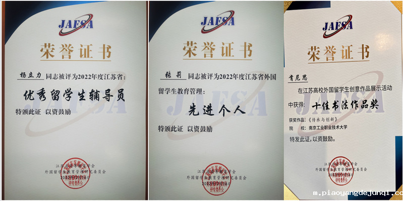我校国际教育学院直属党支部副书记、副院长张莉、副院长张平参会。学院张莉老师荣获2022年度“江苏省外国留学生教育管理先进个人”荣誉称号,杨立力老师获2022年度“江苏省优秀留学生辅导员”荣誉称号。此外,我校来自马拉维的留学生肯尼思在江苏高校外国留学生创意作品展示活动中的获得了“十佳书法作品奖”,来自哈萨克斯坦的留学生安莉的作品获得江苏高校外国留学生短视频大赛“优秀奖”的佳绩。