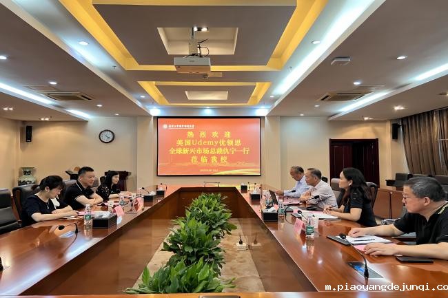 6月19日上午,美国Udemy优领思全球新型市场总裁仇宁一行来我校交流洽谈。党委副书记、校长谢永华以及国际合作与交流处、国际教育学院的负责同志在行政楼辅楼一楼会议室接待了来宾。