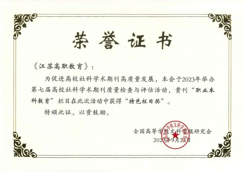 近年来,《江苏高职教育》坚持为繁荣职业教育学术服务、为高职院校改革服务、为促进中外学术传播交流服务、为赓续黄炎培职业教育思想服务的办刊宗旨,走特色化、专题化、品牌化发展之路。在深耕职业教育领域办刊的过程中,本刊注重内涵式发展,精心策划专题,打造特色栏目,刊发了一批高水平研究成果,期刊影响因子逐年提升,学术影响力日益凸显。在宣传学校办学成果、传播学术文化、服务教学科研、促进学术交流等方面发挥了积极作用。2023年3月,入选中国职业高等院校期刊AMI综合评价“职院刊扩展期刊”。此次获奖,是对《江苏高职教育》高质量发展的再次肯定。
