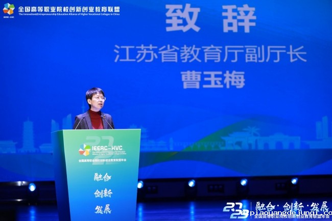 曹玉梅在大会开幕式致辞。她指出江苏是中国近代职业教育的重要发祥地,全省职业教育发展规模、办学水平和综合实力位居全国前列,为经济社会发展输送了大量高素质技术技能人才。此次联盟年会聚焦多个创新创业教育领域的核心问题进行深入研讨交流,对推动高等教育改革创新,提升高校人才培养水平,推进新形势下职业院校创新创业教育高质量发展具有重要意义。她深信在教育部的领导下,全国高等职业院校创新创业教育联盟将会一如既往地搭建好服务平台,深入开展研究,加强交流合作,强化资源共享,推动引领高职院校创新创业的教育改革,助推社会经济高质量发展,为教育强国的建设贡献力量。