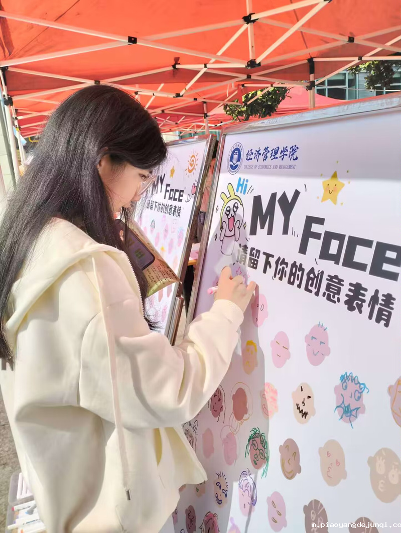 在经管学院的活动帐篷内,摆放的表情展板引人注目,这里正是创意表情包绘制的区域。同学们纷纷拿起画笔,发挥想象力,将喜怒哀乐的情感通过画笔和色彩表现得淋漓尽致。有的表情包俏皮可爱,有的则深沉内敛,每一张都充满了同学们的创意和个性。这些表情包不仅展示了同学们的艺术才华,更传递出一种积极向上、乐观面对生活的态度。